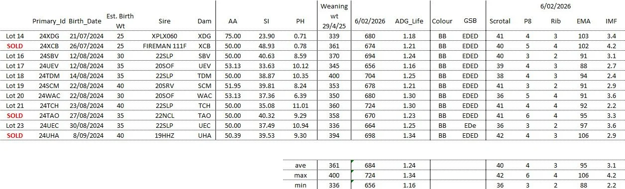 IMF marbling, eye muscle area, growth and fertility are key performance traits.